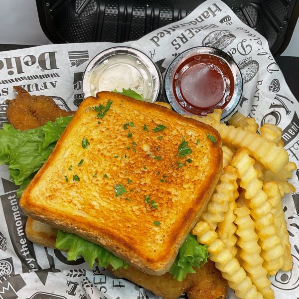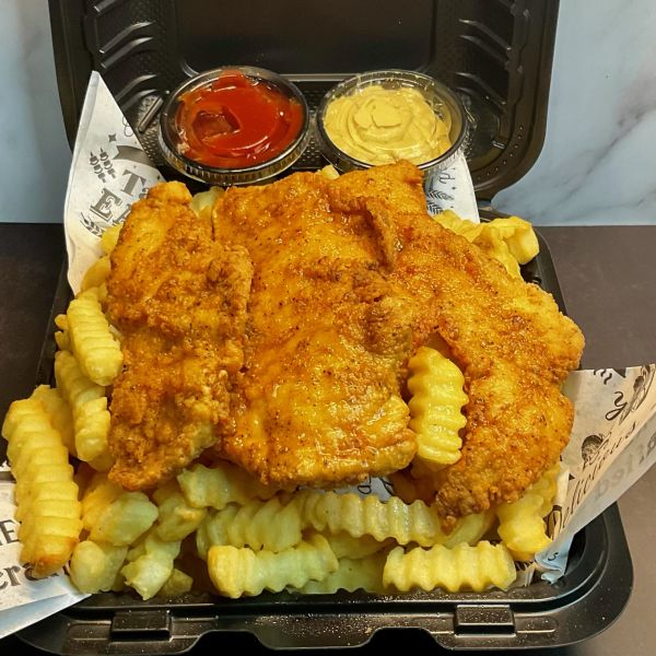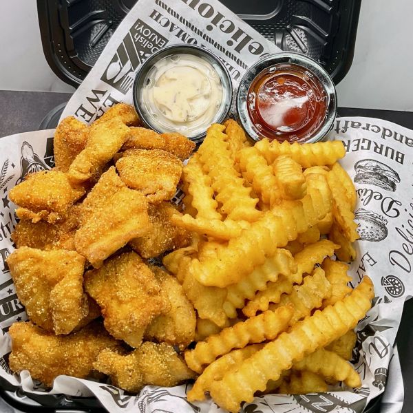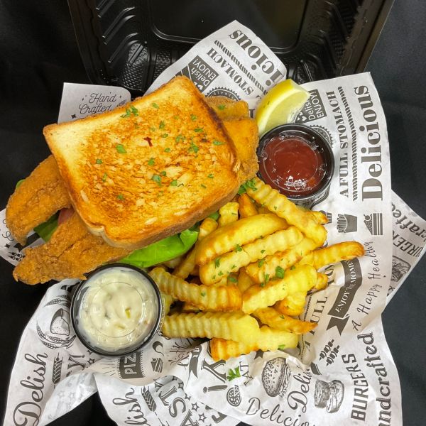 With a bed of fries, ketchup and tartar sauce in a basket.