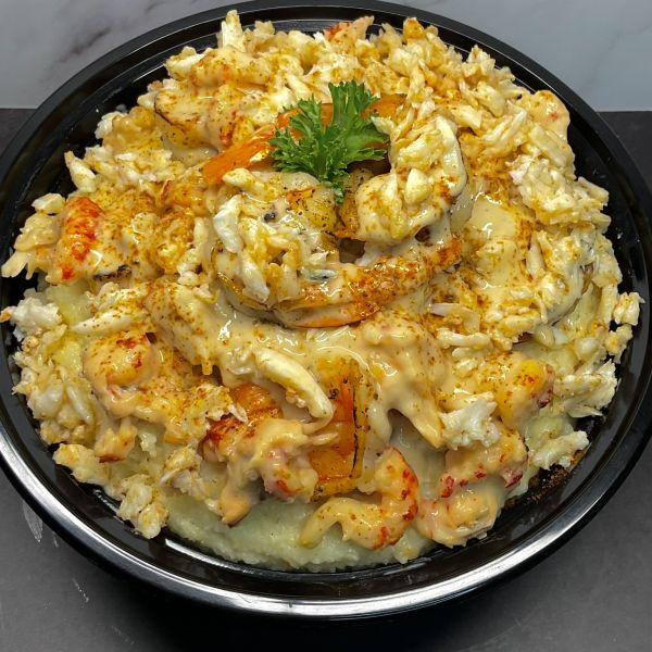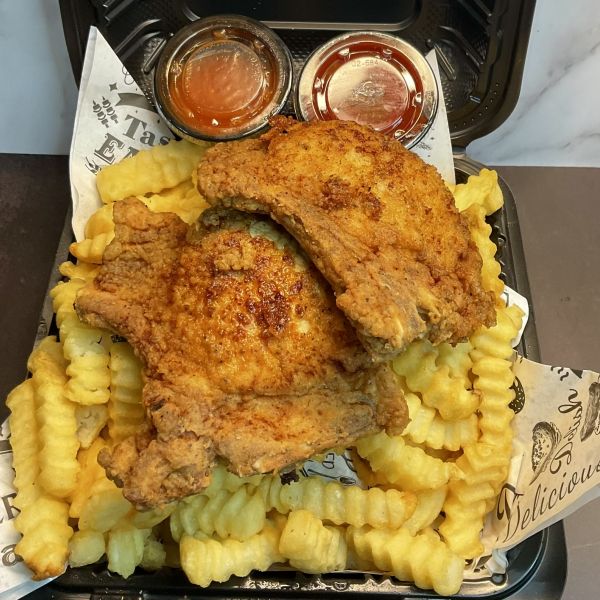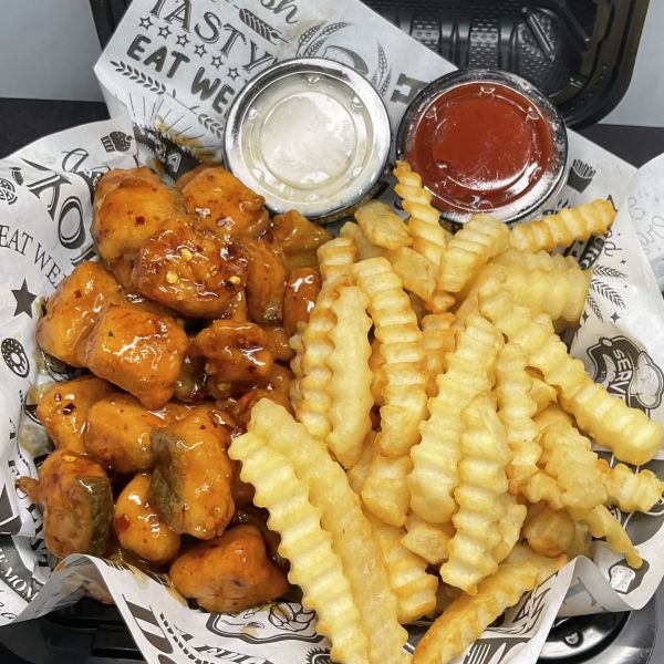 With a bed of fries, ketchup and chipotle buffalo mayo.