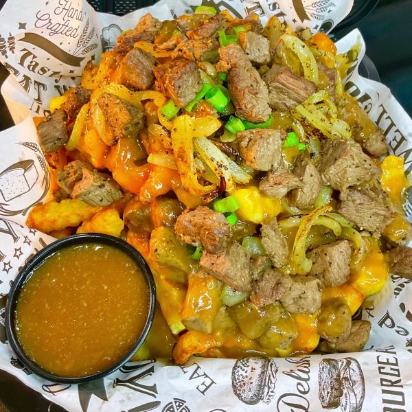 Served with caramelized onions and a drizzle of brown garlic gravy over a bed of fries.