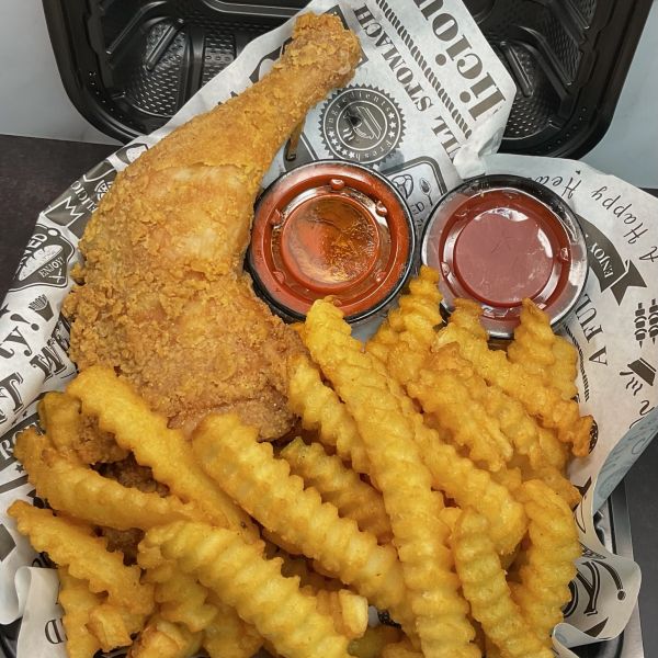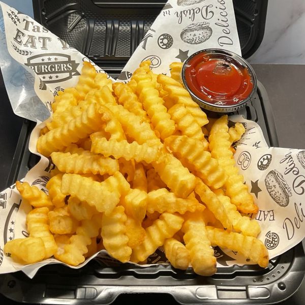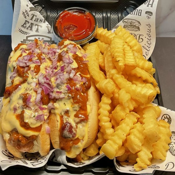 With a bed of fries, ketchup and GG’z Signature sauce.