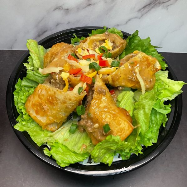 Smothered ground beef with peppers in a deep fried, golden flaky eggroll wrap