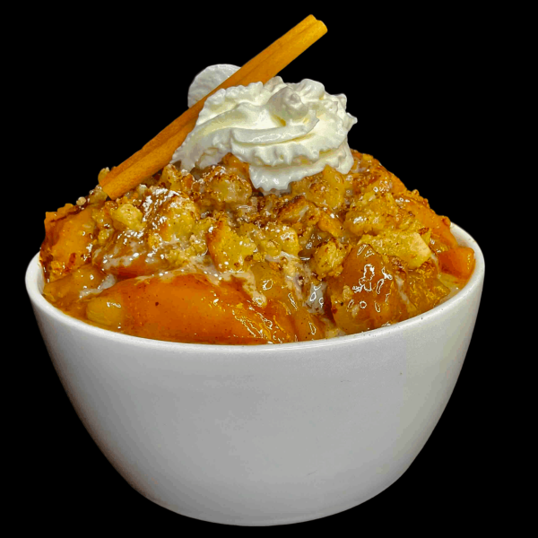 Peaches are slow-cooked with homemade buttermilk biscuits. Includes a side of southern cinnamon-vanilla cream sauce to drizzle.