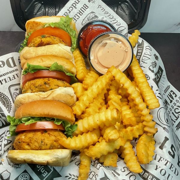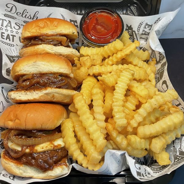 Mini-beef patties, smothered in a brown onion gravy, topped with melted white cheese, and caramelized onions on a mini bun and fries.